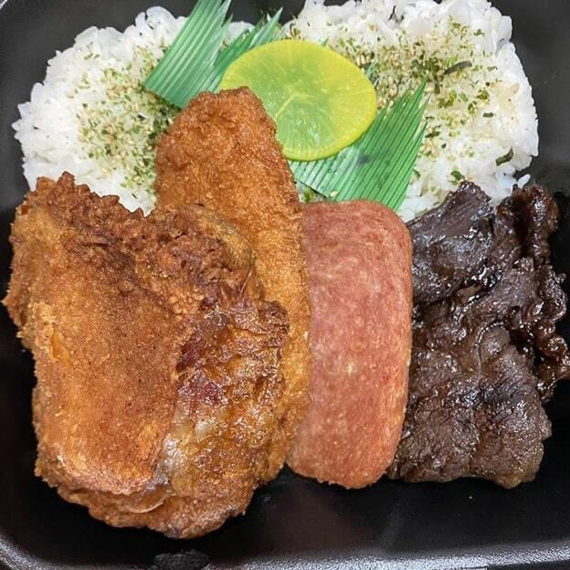 Plates come with 2 Scoops Rice, 1 Scoop Mac Salad, and a large protein portion