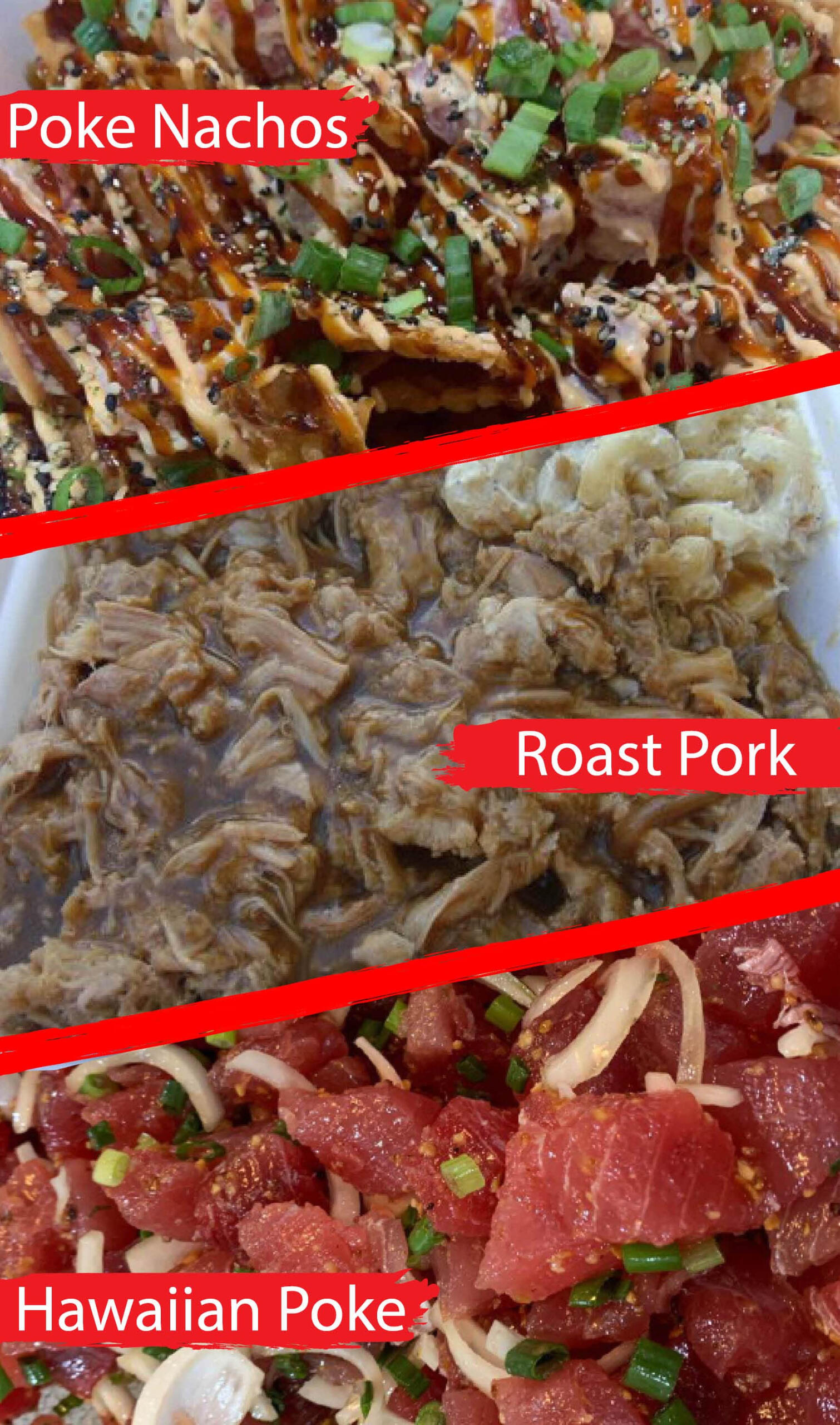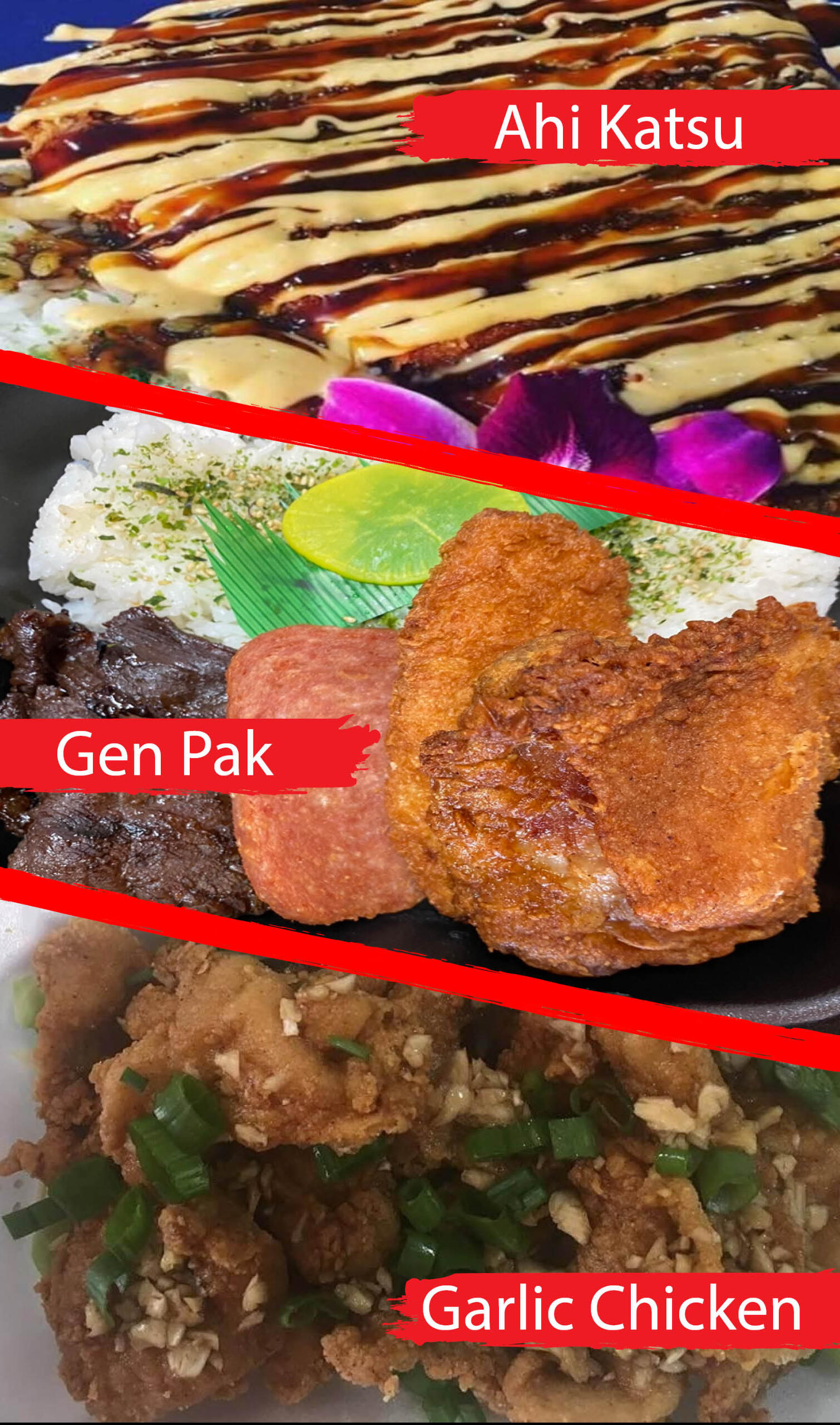 Plates come with 2 Scoops Rice, 1 Scoop Mac Salad, and a large protein portion